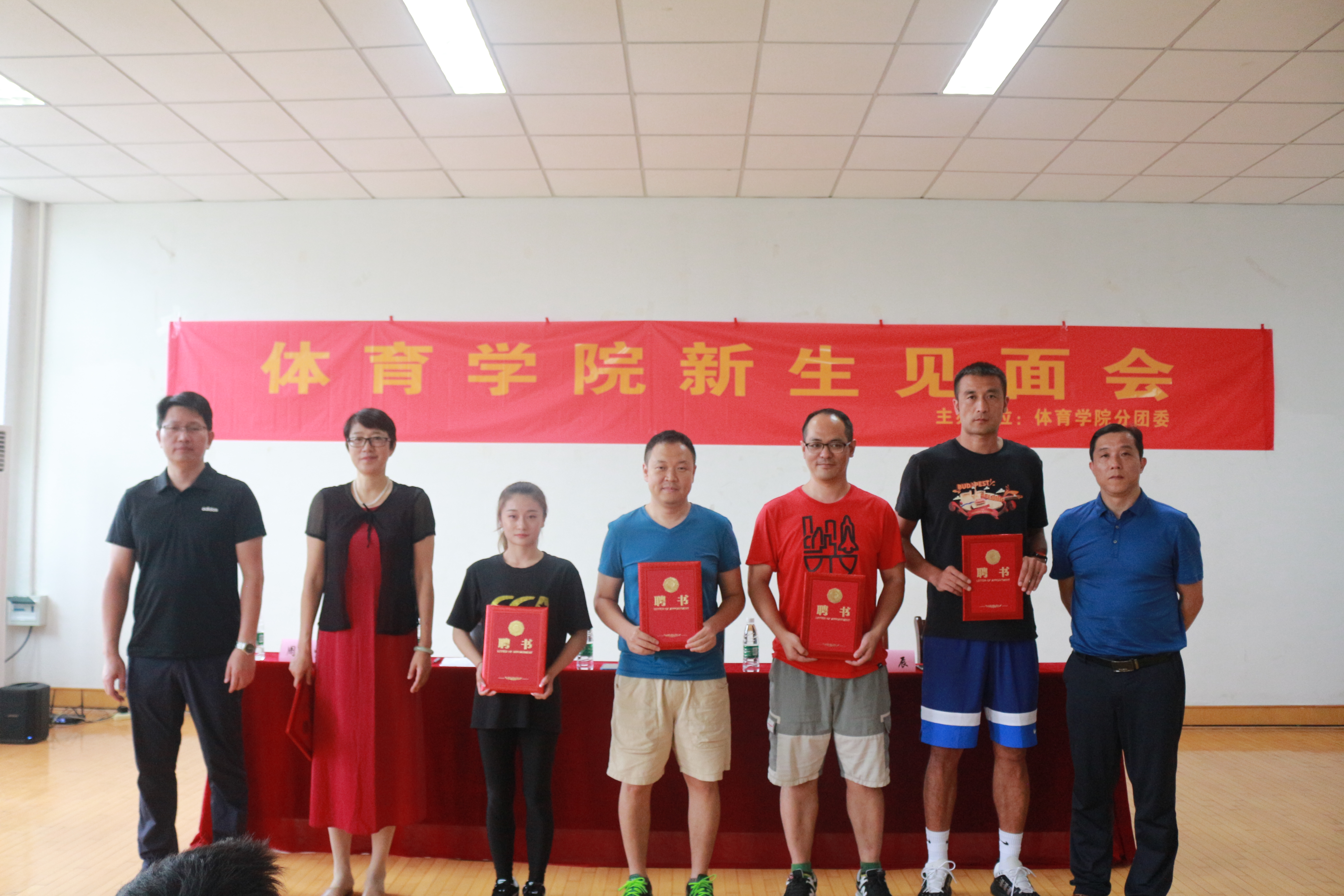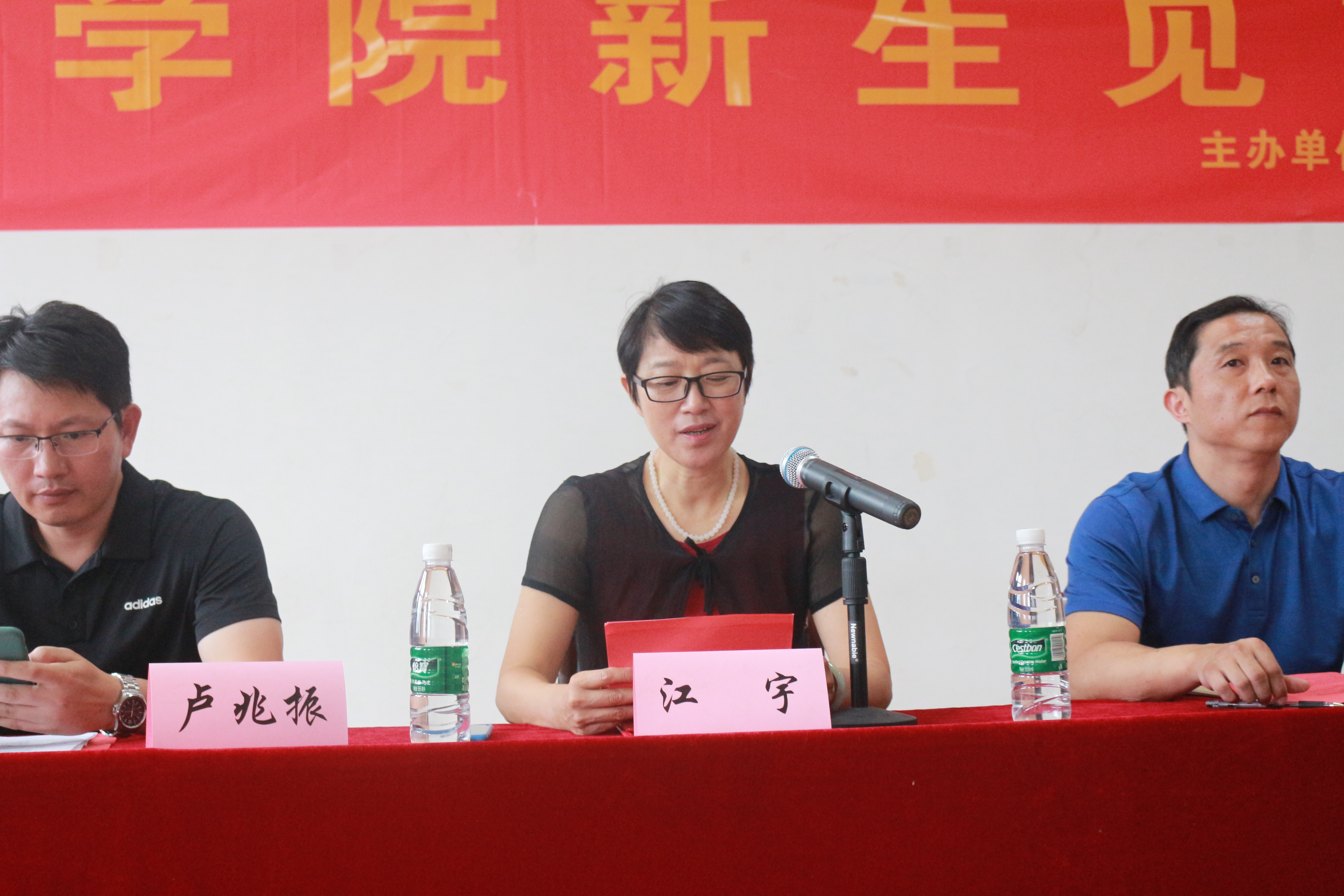 胡辰书记首先介绍了体院领导嘉宾、辅导员和班主任,接下来由学院领导为新生班主任及助理班主任颁发聘书,并合影留念。体育学院江宇院长、院长助理卢兆振老师、党总支胡辰书记分别致辞。江宇院长致辞欢迎并介绍了校情院情,向新生们表示了衷心的祝贺和欢迎。卢兆振老师介绍了体院学科专业教育及教学安排。胡辰书记在最后对新生们进行了大学生的信仰教育及大学生活管理指导。