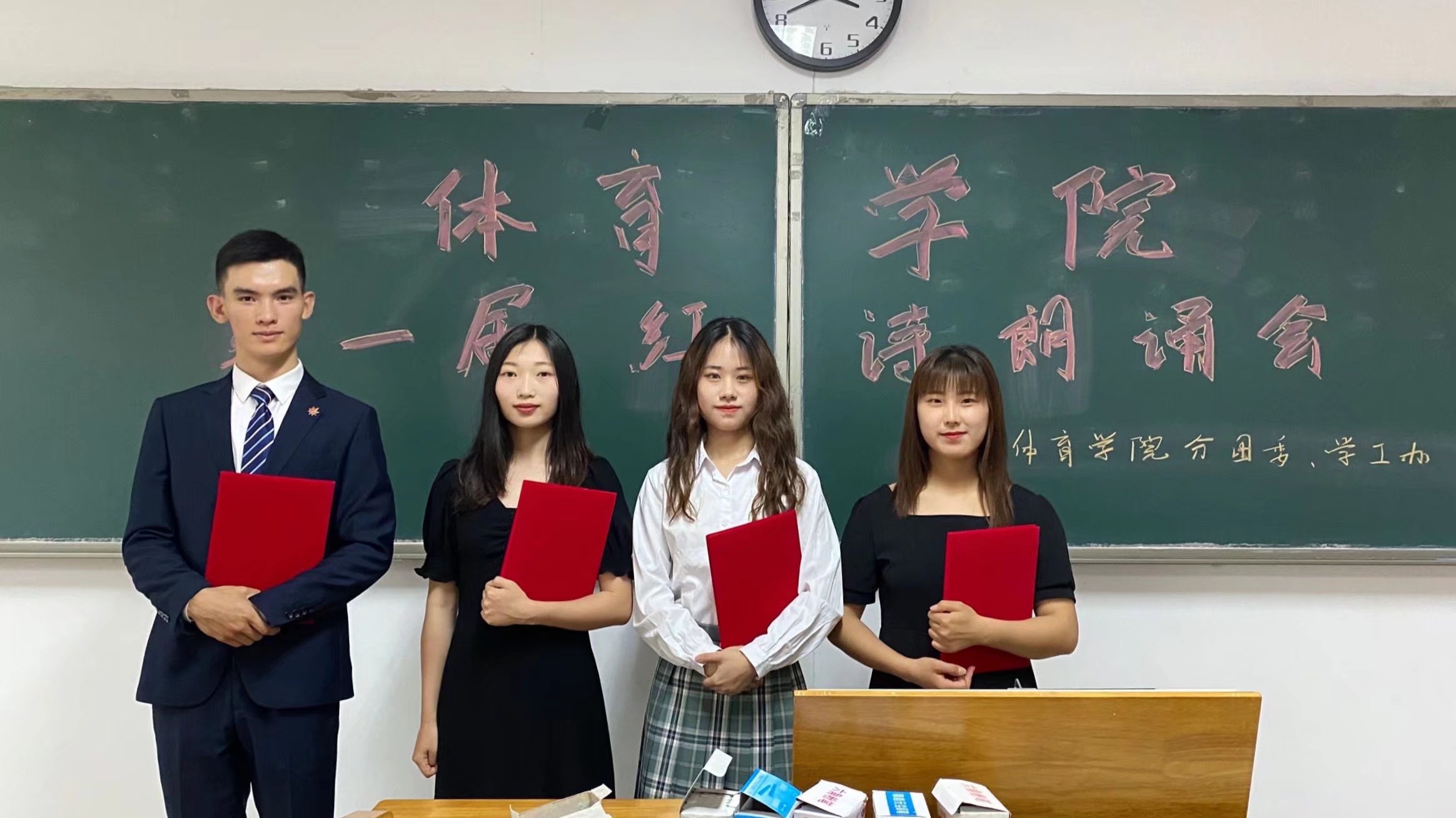 5月11日,我院分团委、学工办联合举办第一届红色诗歌朗诵会,全院共有11个班级参加比赛,体育学院分团委书记刘世强老师、体育学院学生会主席晁加旋、外国语学院学生会主席魏蕤晴、新闻传播学院学生会主席丁璐、17级体教定向班班长邓凌云、17级社体班团支书魏春晓担任本次朗诵会的评委。