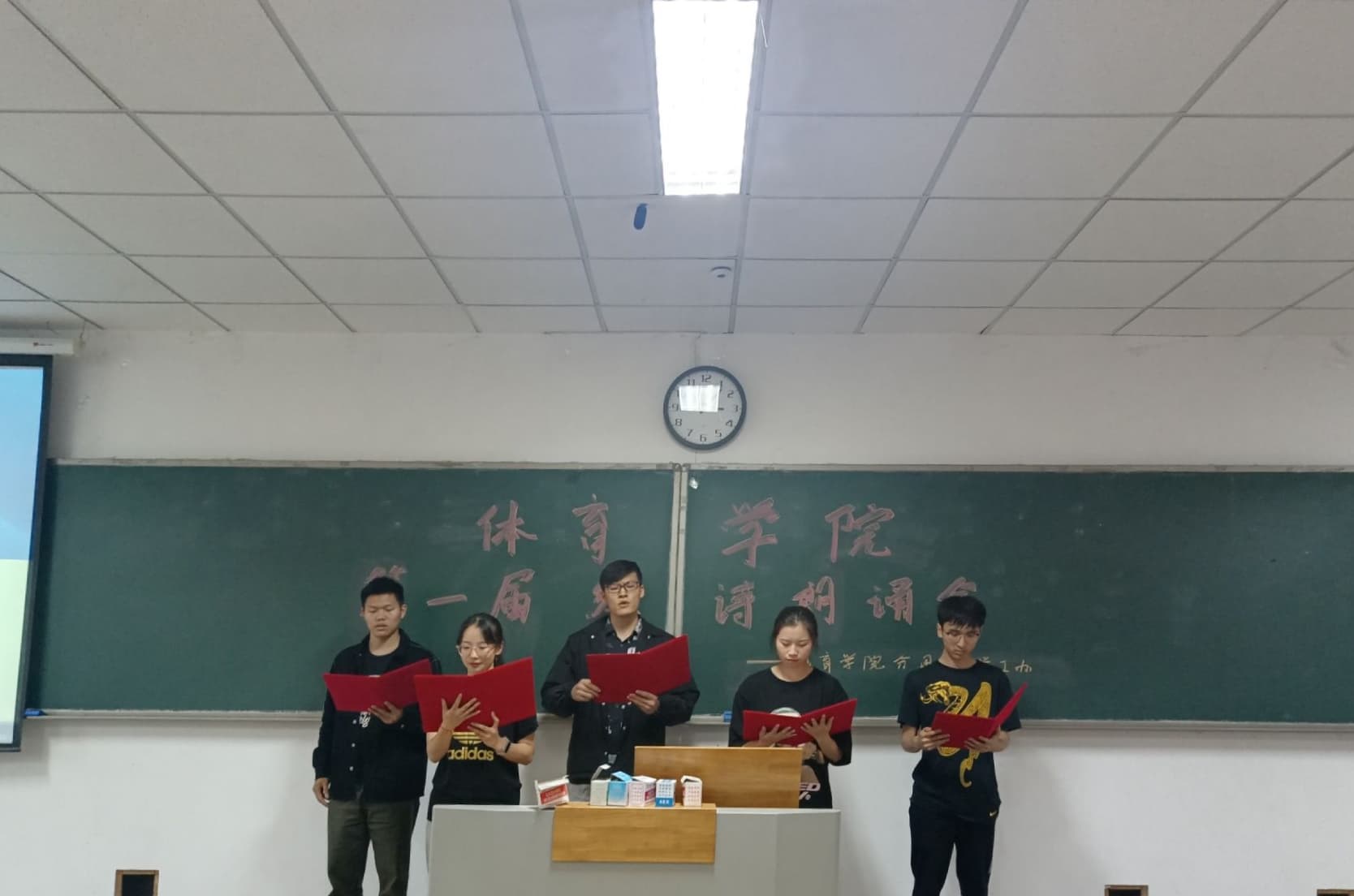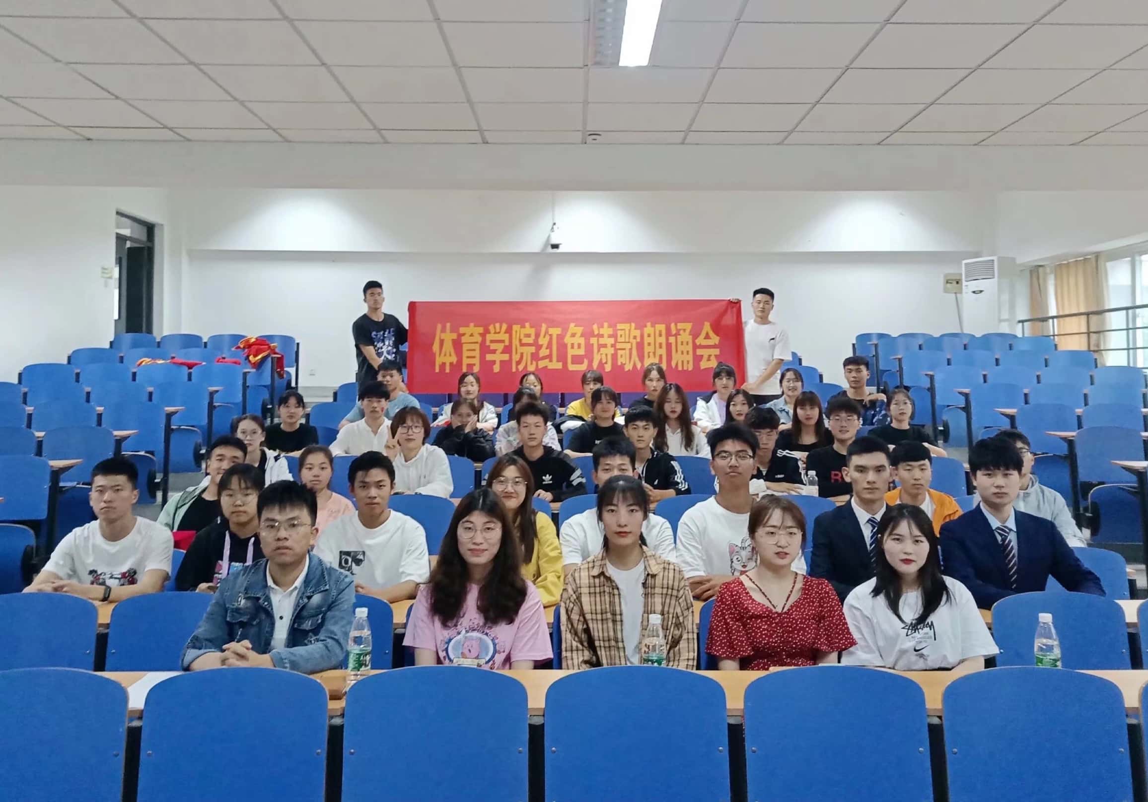 参赛学生激情饱满的朗诵感染了现场师生观众,《沁园春•雪》《沁园春•长沙》《满江红》《时代的囚徒》《追寻红色记忆》《中华世纪坛序》等一首首经典的红色诗歌让体院学子深受思想的洗礼。经过评委认真规范的打分,最终19级体教2班《中华世纪坛序》获得本次朗诵会的第一名。