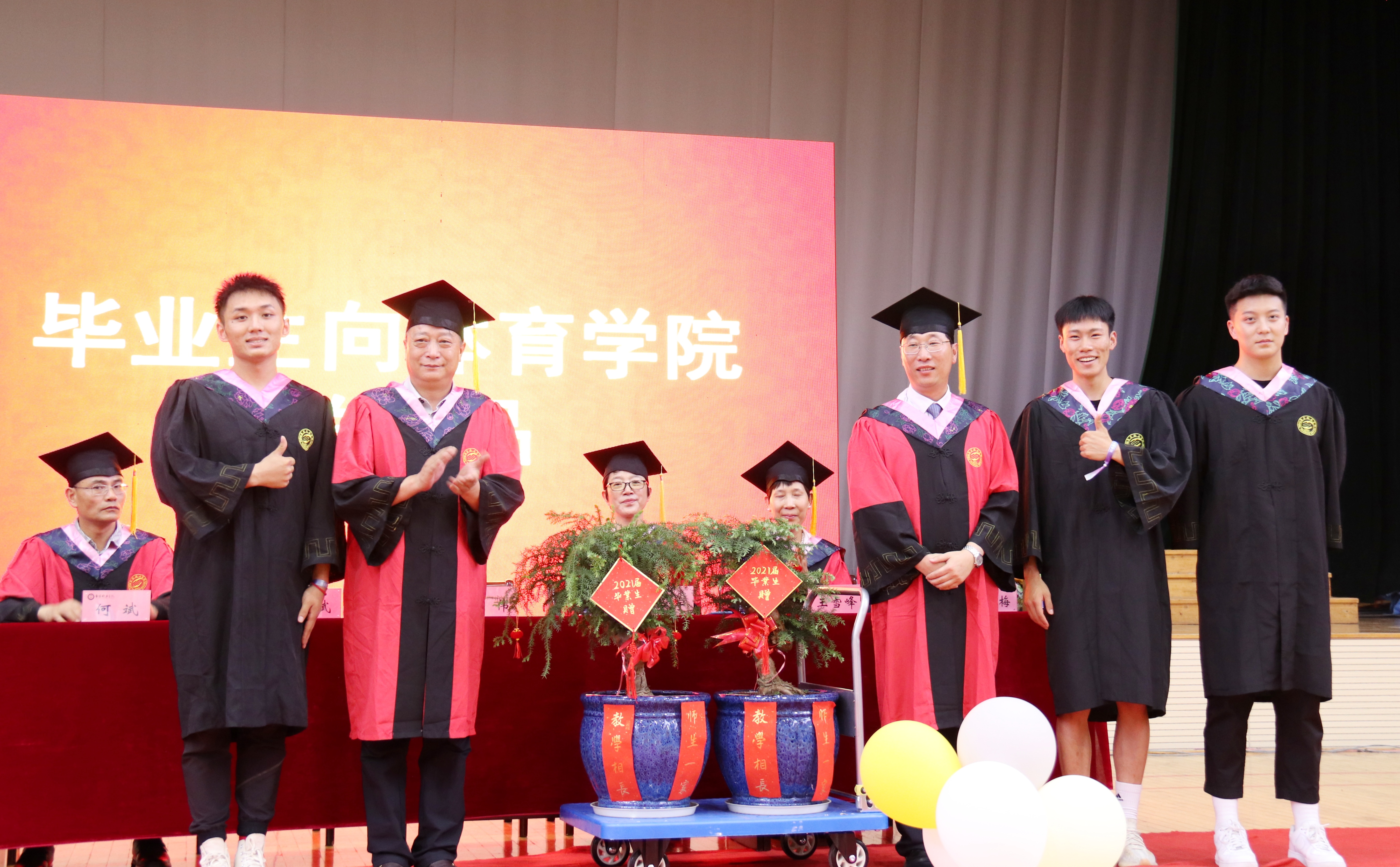 郜斌书记宣读了体育学院优秀毕业生名单,并为优秀毕业生颁奖,毕业生代表分别为班主任献花、向学院赠送礼物以表达四年来的感恩。在主席台就坐的导师团为毕业生一一授予学位,并送上毕业祝福,毕业典礼在《明天会更好》的师生合唱中结束。