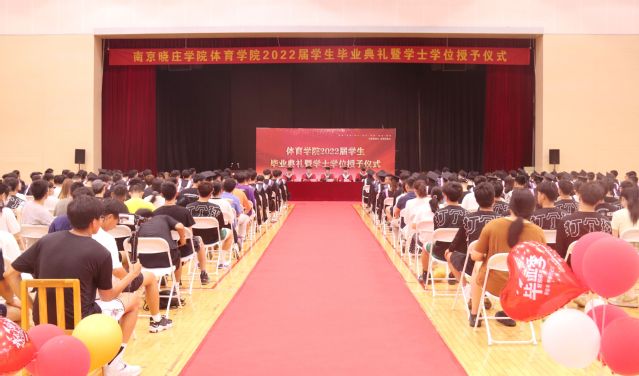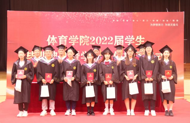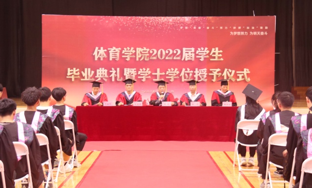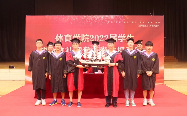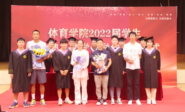 2点整,全体毕业生在现场师生的热烈欢迎中穿过气球拱门,步入红毯,来到典礼现场。郜斌书记介绍出席毕业典礼的领导和嘉宾老师,毕业典礼在雄壮的国歌声中正式开始。院长助理赵喜迎分别宣读《体育学院2022届准予毕业的学生名单》、《体育学院授予2022届本科毕业生学士学位的决定》和《关于表彰体育学院2022届“优秀毕业生”的决定》。学院导师团走进学生中间,为全体毕业生一一送上祝福、拨穗授礼。在主席台就坐的领导老师为优秀毕业生颁发荣誉证书和纪念礼品。毕业生代表为学院赠送象征“扬帆远航”的帆船,为班主任献花。