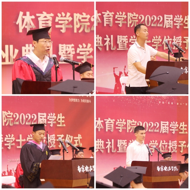 2018级体教3班晁加旋代表全体毕业生发言,表达了对学院培养、老师辛勤付出的感激之情,表示一定会牢记“教学做合一”校训,在新的工作岗位上再创佳绩。2019级体教2班高雪龙代表在校生发言,对全体毕业生送上最真挚的祝福,表示将会以学长学姐为榜样,脚踏实地,扎实苦干。教师代表陈超老师在发言中指出,大学四年见证了各位同学一步一步的成长,希望同学们带着学到的知识行囊,在社会的大舞台上不断增长见识,并祝愿全体毕业生你们在未来的道路上乘风破浪,所向披靡。