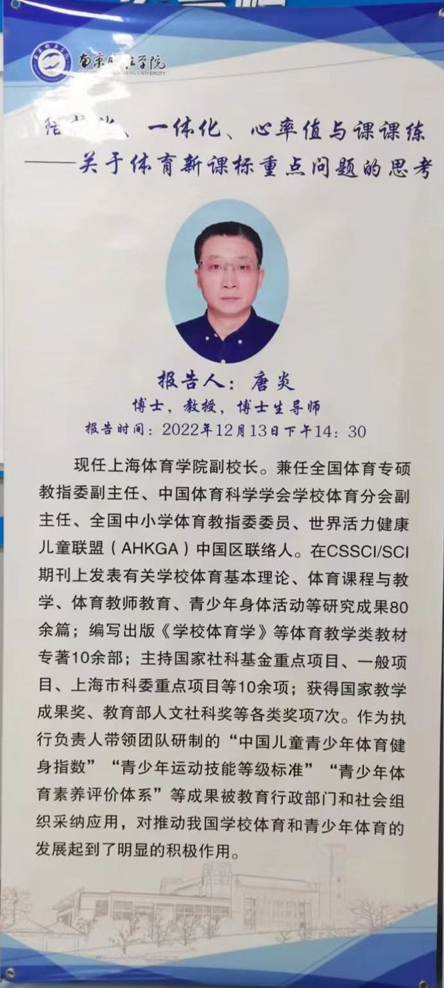 2022年12月13日下午,我院邀请上海体育学院副校长唐炎教授为我院教师做《结构化、一体化、心率值与课课练——关于体育新课标重点问题的思考》的学术报告。
