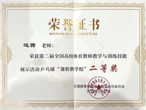 由教育部全国高等学校体育教学指导委员会主办的第二届全国高校体育教师教学与训练技能展示活动于5月28日在浙江财经大学落下帷幕,连茜老师经过省内选拔,代表江苏省参与青年教学组比赛,获得乒乓球课程教学组二等奖。