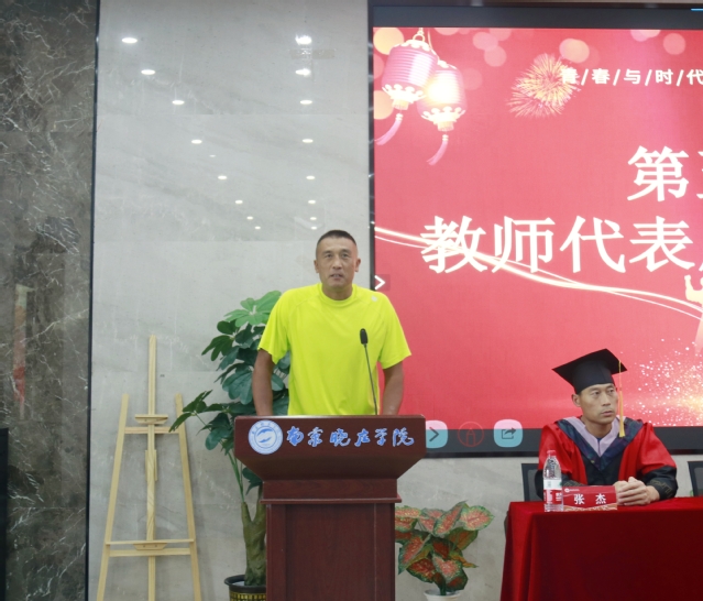 教师代表周大亮老师在发言中指出,大学四年同学们留下了难忘的记忆,学院和老师见证了各位同学一步一步的成长,希望同学们做一个善良、正直的人,并祝愿全体毕业生在未来的道路上乘风破浪,有机会常回来看看。