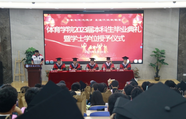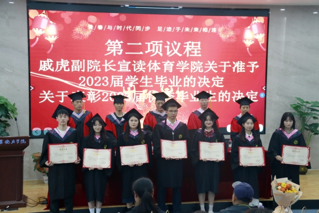 毕业典礼开始前,学院毕业生观看了学校毕业典礼现场直播,并一同观看了大学四年的精彩瞬间视频和学院师生的祝福视频,浓浓的不舍之情涌上师生心头。上午11时许,主持人介绍出席毕业典礼的领导和嘉宾老师,毕业典礼在雄壮的国歌声中正式开始。副院长戚虎教授宣读了《体育学院2023届准予毕业的学生名单》和《关于表彰体育学院2023届“优秀毕业生”的决定》,随后,在主席台就座的领导老师为优秀毕业生颁发荣誉证书和纪念礼品。毕业生代表为辛苦付出四年的班主任献上鲜花,为学院赠送礼物。