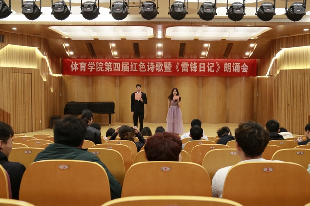 3月26日下午,体育学院在行知音乐厅举办了体育学院第四届红色诗歌暨《雷锋日记》朗诵会,学院60余名学生参加,学院辅导员刘世强老师、团委书记夏菁老师和教师学院辅导员徐艺嘉老师出席并担任本次比赛评委。