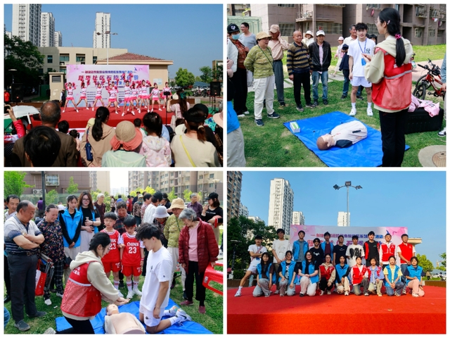体育学院“陶小红”应急救护志愿队的志愿者在活动现场开展应急救护知识宣讲,帮助社区居民提升救护知识水平。幼儿师范学院啦啦操队以一段青春活力的啦啦操表演带动了现场氛围,充分展现了晓庄学生的青春活力,赢得了在场观众的阵阵掌声。