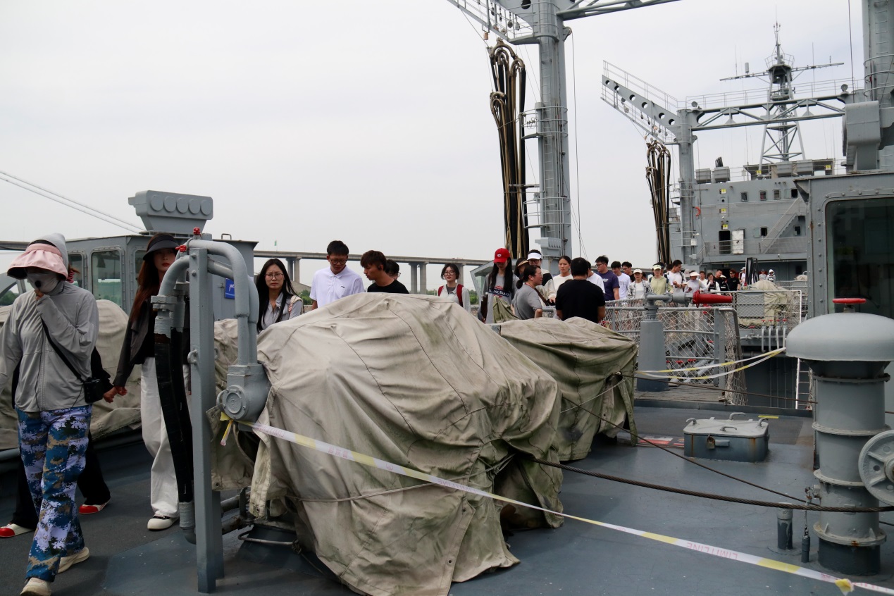 在泰州海军舰艇文化园,学生们走上海军“三舰一艇”:881洪泽湖号补给舰、108西宁号驱逐舰、515厦门号护卫舰和274号潜艇,上甲板、进船舱、下潜艇,近距离感受人民海军的生活工作环境,尤其在274号潜艇中,狭小的密闭空间、到处弥漫的机油气味、密密麻麻的设备按钮,带给学生极大的震撼。