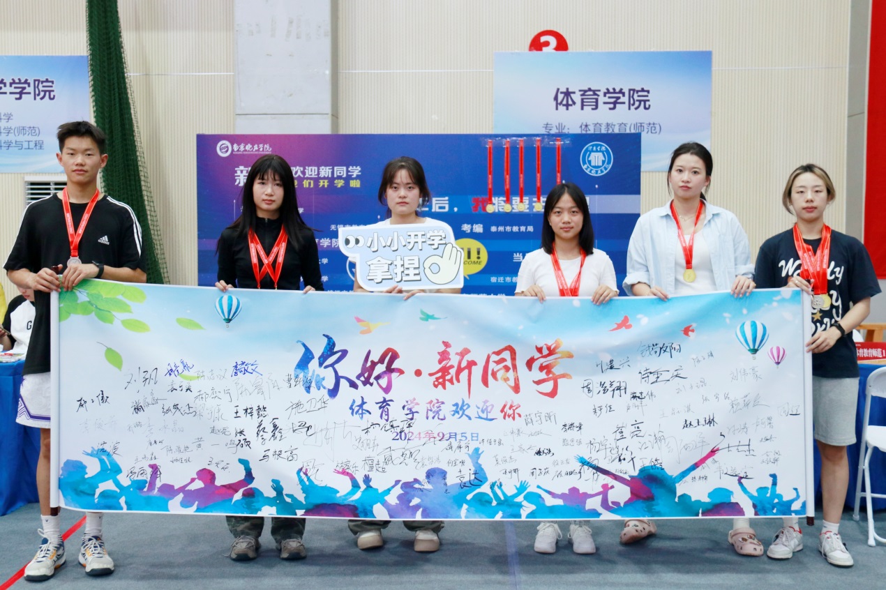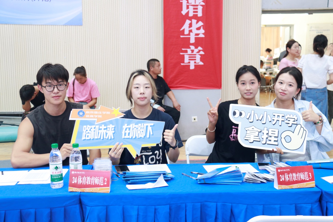 今年为了突出体育学院的特色,邀请曾参加2024年江苏省体操比赛的获奖同学担任迎新志愿者,他们胸前挂着获奖奖牌,用微笑、真诚为新加入体育学院的新生们办理入学手续,查看录取通知书、高考准考证、身份证核验比对学生身份,发放银行卡、校园一卡通、宿舍钥匙等,指导新同学快速完成入校手续办理。