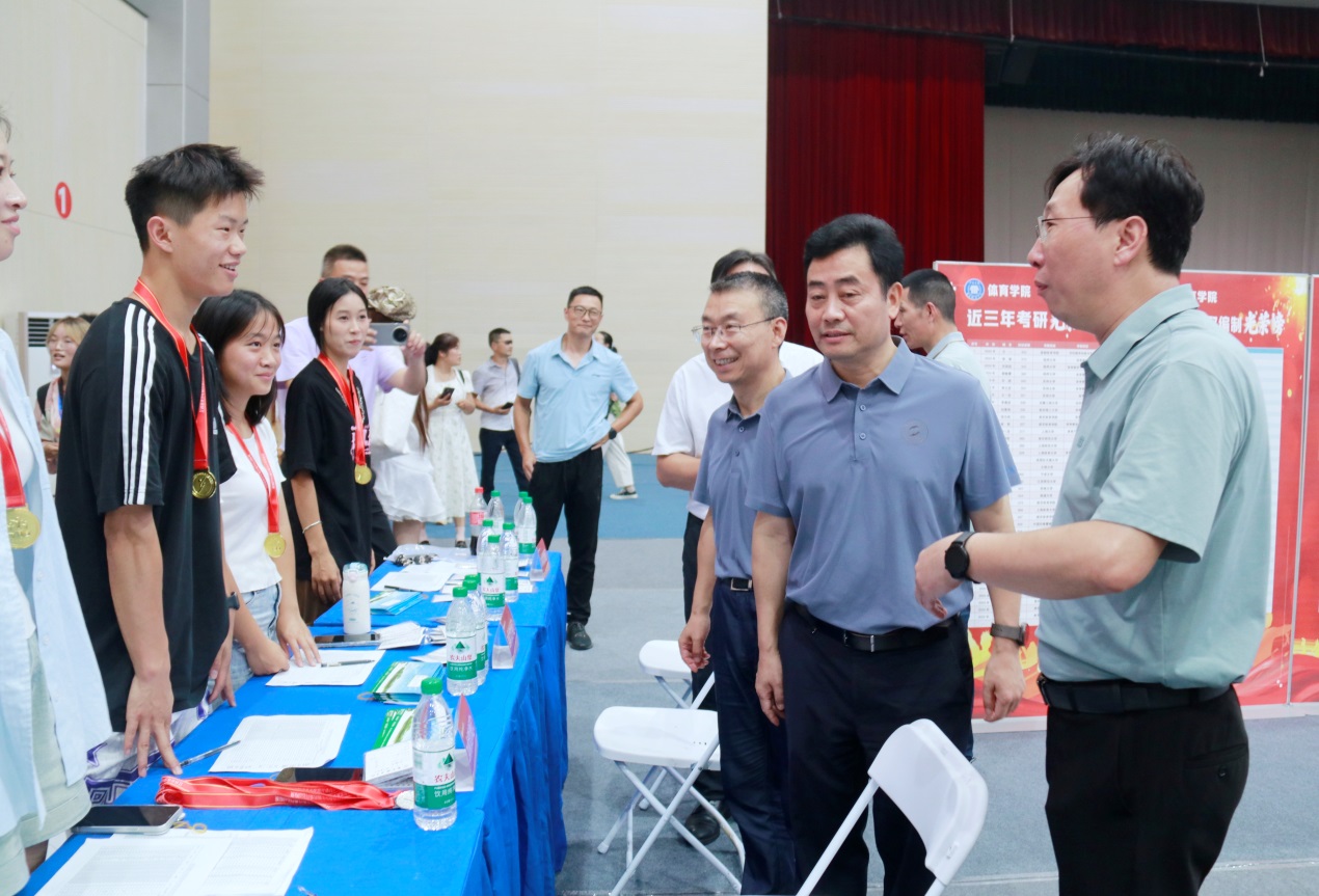 在体育学院新生报到现场,张志华校长、鲁学军副校长等领导到场了解学院学生报到情况,慰问迎新工作人员,张校长见到佩戴奖牌的迎新志愿者询问他们参加体育比赛的情况,要求他们细致、认真完成迎新工作,并鼓励他们奋勇拼搏,弘扬体育精神,在各类赛场上争金夺银,为学校争光,为自己喝彩。