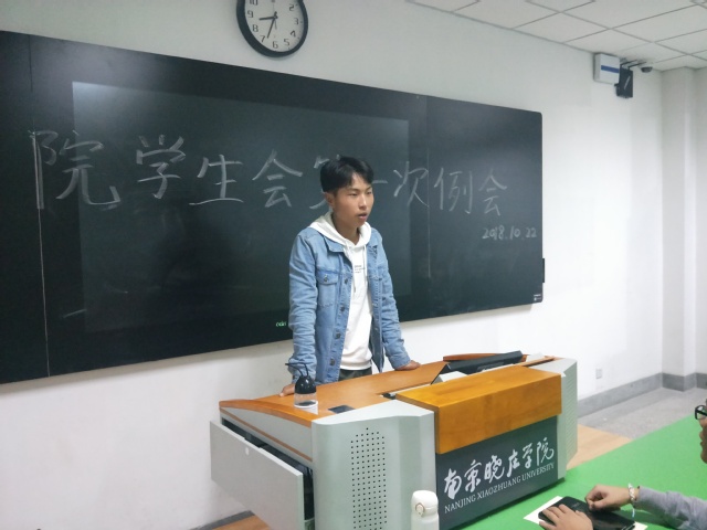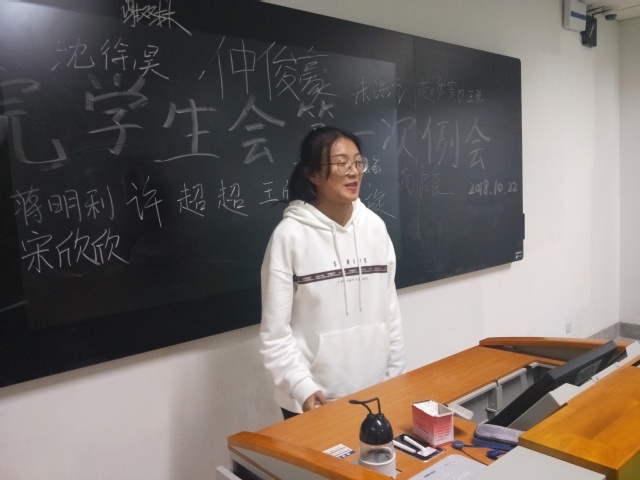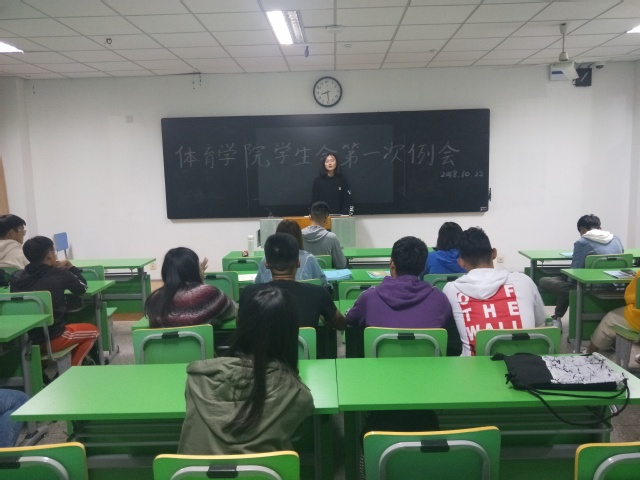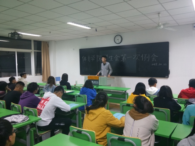 2018年10月22日,在行知组团d楼403,体育学院学生会召开了开学以来的首次例会。本次例会共分为两个议程。第一个议程是学生会成员进行自我介绍,在会议的一开始,程浩主席为大家正式加入学生会表示热烈的欢迎,同时也表达对学生会未来的期望。接下来是由分团委副书记王静漪进行自我介绍,同时也向学生会的成员提出要求,只有完善好自身才能更好的为学生们服务。之后是由各部门部长以及干事依次上台进行自我介绍,场面十分活跃。第二个议程是主席程浩与分团委副书记王静漪介绍广播操比赛的赛事流程以及各环节的任务发布,这是本学期开学以来体院学生会组织的首个校级比赛,确保全员参加。通过这次广播操比赛,可以加深学生会成员之间的感情,让大家更快的成为一个集体,更快的了解学生会。